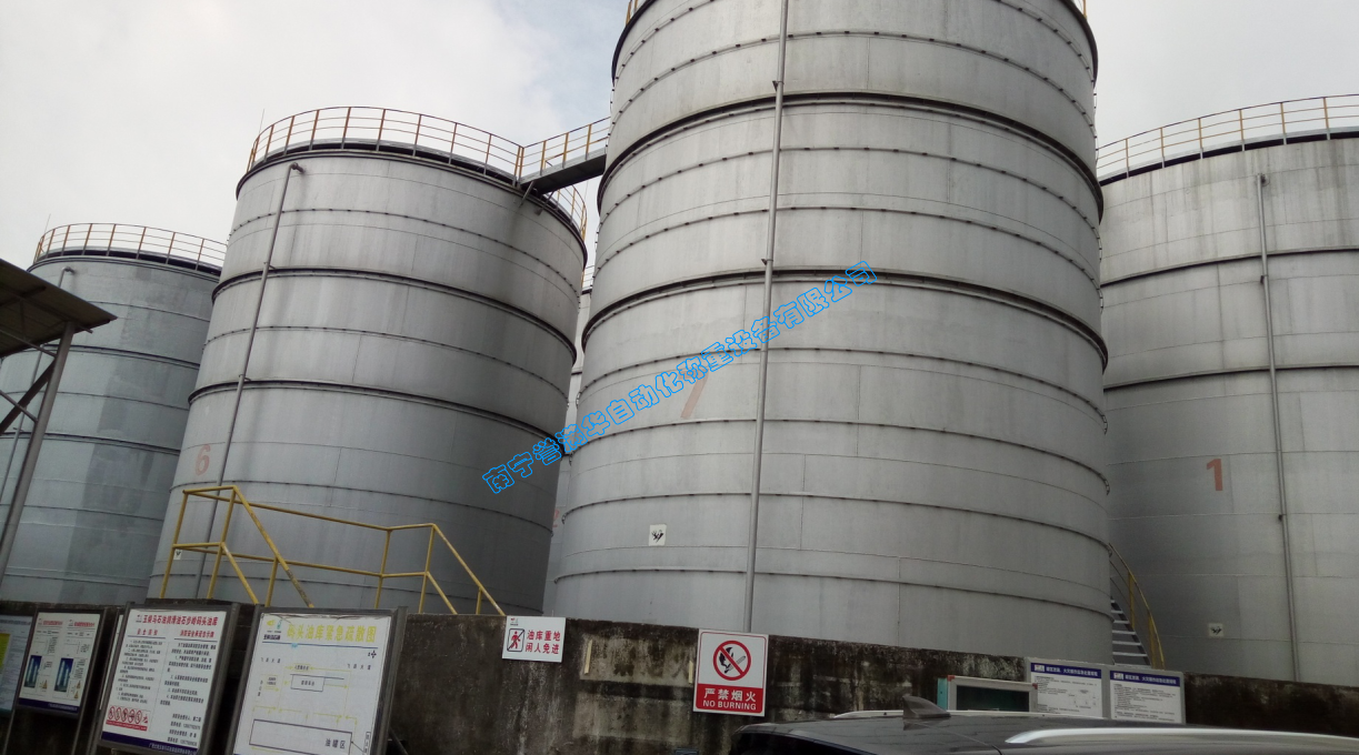 經南寧譽滿華自動化工程師極其細致的進行算法模型設計及編程,現場根據其罐體以及油品類型、密度、特性進行多級分段計算累加,采用微積分算法,能將其油位高度測量誤差在±20mm內。是一個經典的PLC自動化、信息化系統。